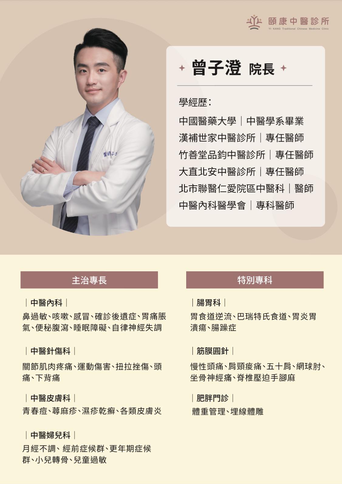 腸胃科中醫專家、過敏免疫體質調理。專長以中藥治療胃食道逆流等胃腸機能障礙與各類過敏性疾患。