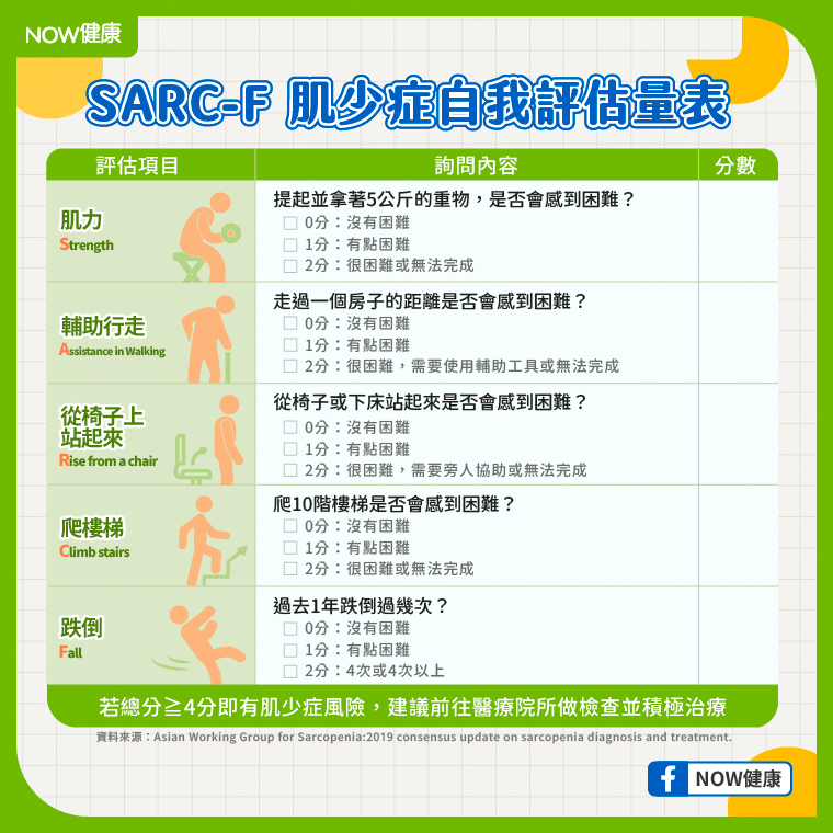 ▲SARC-F肌少症自我評估表。(圖/NOW健康製作)