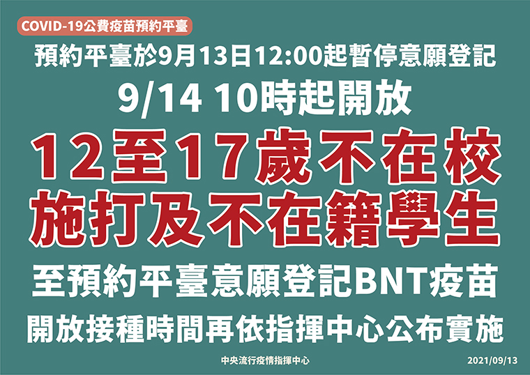 ▲明(14)日10時將開放12至17歲不在校與不在籍學生,登記接種輝瑞BNT意願,施打時間再行宣布。(圖/中央流行疫情指揮中心提供)