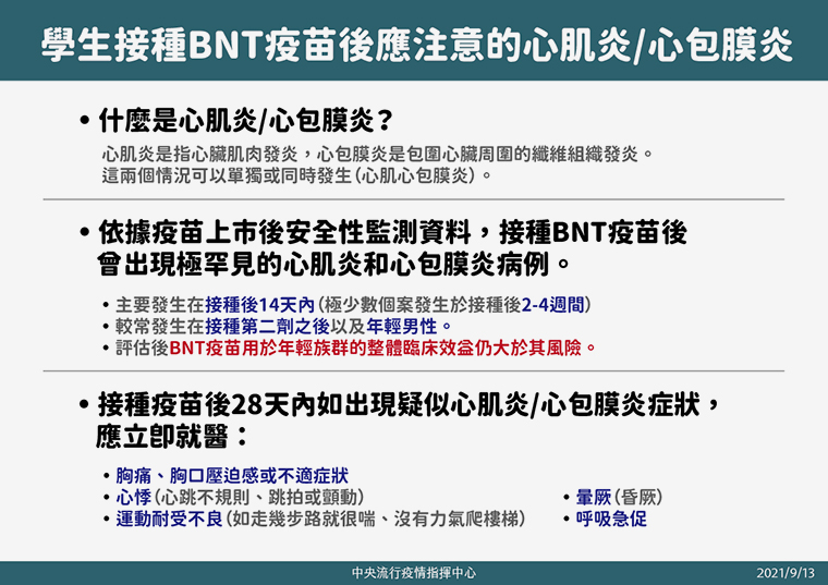 李秉穎持續說明,根據國際監視資料,如果接種輝瑞BNT疫苗發生心肌炎或心包膜炎,容易在14天內發生,極少數出現在施打後2至4周,尤其在施打第2劑時,或30歲以下男性較為常見,評估整體效應仍然利大於弊。
