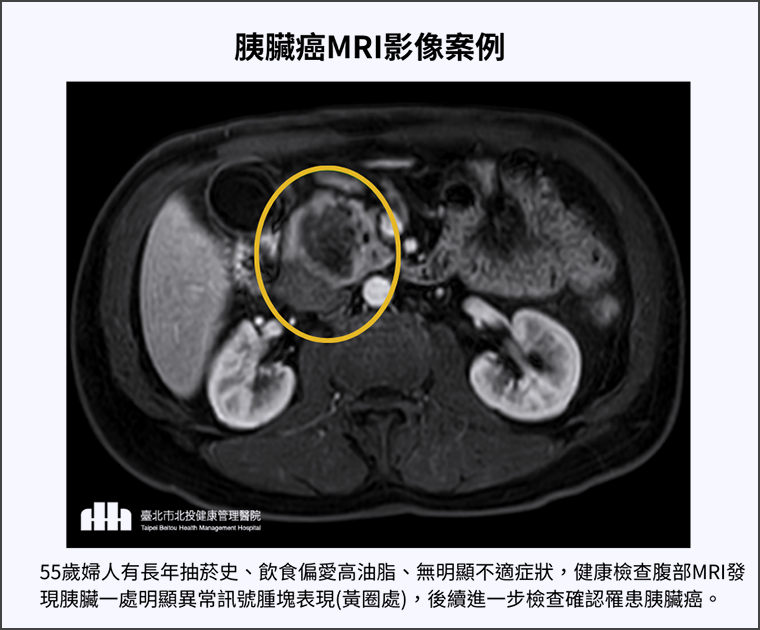 ▲醫師從腹部磁振造影(MRI)橫切面影像發現,楊姓婦人胰臟有腫塊。(圖/北投健康管理醫院提供)
