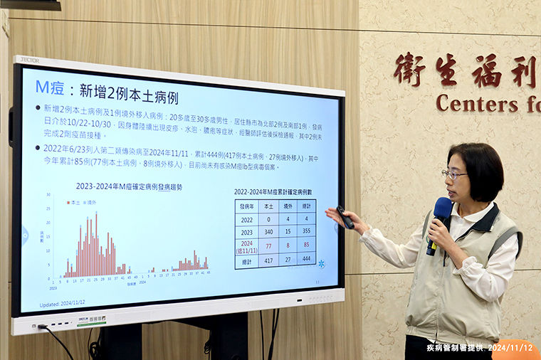 疾管署指出,我國自2022年6月23日將M痘列為第2類法定傳染病,截至本年11月11日累計確診444例病例(417例本土及27例境外移入),其中今年確診85例(77例本土、8例境外移入),目前尚未有感染M痘Ib型病毒個案,惟須留意境外移入個案造成國內傳染風險。