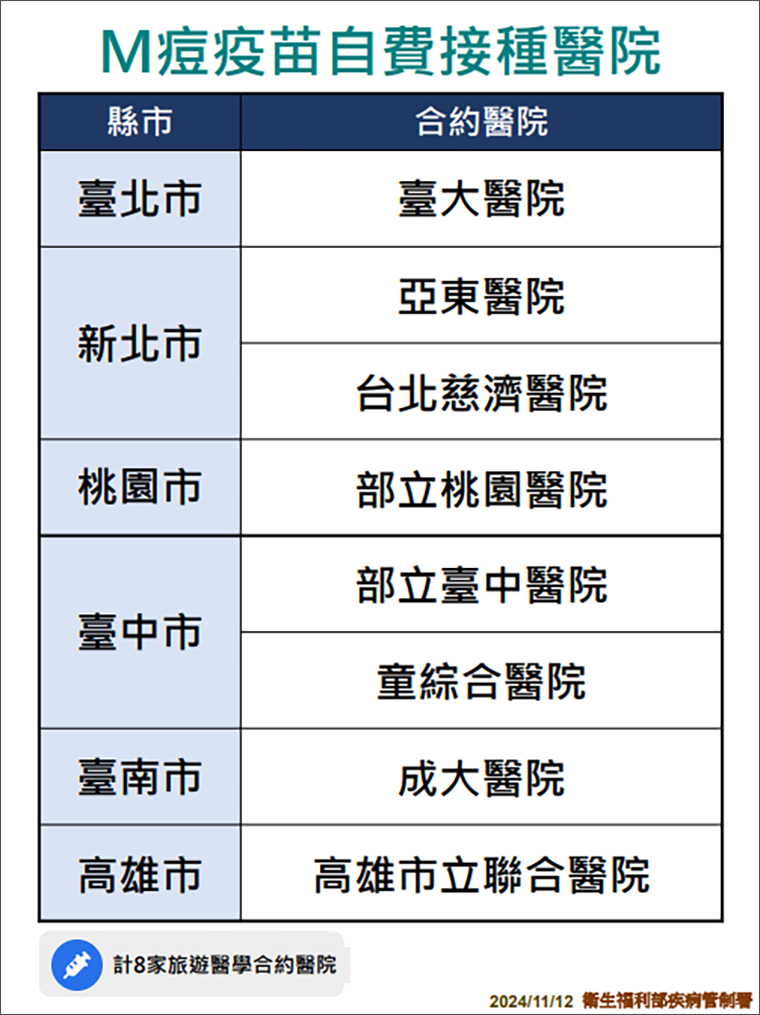 關於自費接種M痘疫苗政策,疾管署說明,現階段考量民眾接種需求及旅遊醫學門診服務量能,由6個直轄市8家旅遊醫學合約醫院(包含臺大醫院、亞東紀念醫院、台北慈濟醫院、衛福部桃園醫院、衛福部臺中醫院、童綜合醫院、成大附設醫院及高雄市立聯合醫院)優先實施,後續將視執行情形調整。