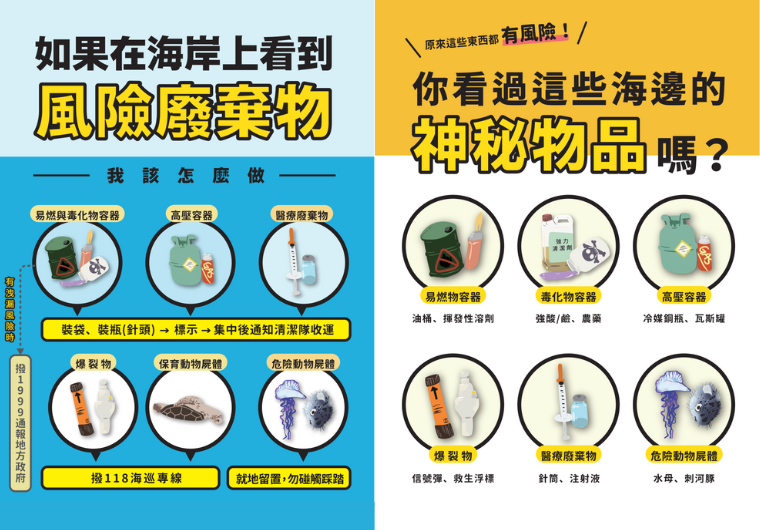 環管署署長顏旭明表示,為了進一步降低民眾參與海岸清理的危害風險,製作了宣導資訊,透過生動的圖示提醒參與淨灘者隨時注意,在遇到可疑風險廢棄物時保持冷靜、謹慎應對。若在海岸上看見易燃物質容器、毒化物容器、高壓容器、醫療廢棄物,因其可能有滲漏、揮發、燃燒爆炸和穿刺的風險,建議民眾通報各地方政府1999專線。而若遇到爆裂物及保育類動物屍體,除保持距離外,建議撥打海委會海巡署118專線通報。期盼透過推廣宣導,讓民眾在參與海洋保護的同時能更加安全有保障。