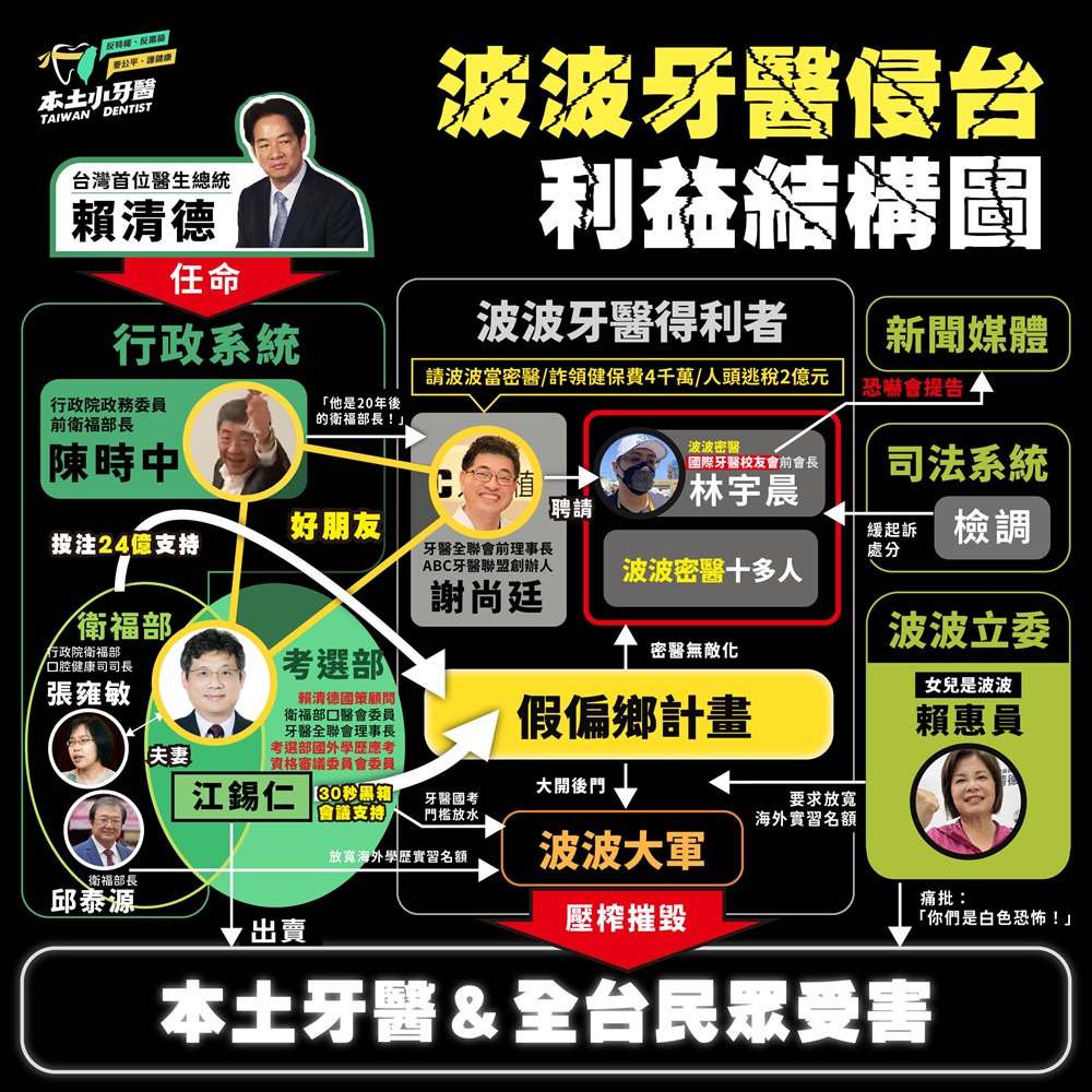這群忿怒的基層牙醫更進一步繪製「波波牙醫侵台利益結構圖」,指出行政系統、護航立委、雇用波波牙醫當密醫的診所,政府放寬牙醫國考審核資格,一連串的現象讓波波牙醫快速成為正式牙醫,影響國人看牙安全。