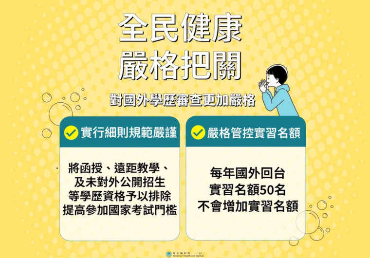 2.衛福部近日將公布「醫師法」施行細則,更嚴格審查國外學歷者,排除函授、遠距教學、以及未對外公開招生等學歷,提高參加國家考試的門檻。