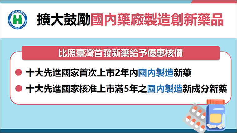 ▸擴大鼓勵國內藥廠製造創新藥品,凡是在10大先進國家首次上市許可2年內在國內製造的新藥(如CDMO委託台灣製造);或是10大先進國家核准上市滿5年,在國內自行研發的新成分新藥,將可比照台灣首發新藥,給予優惠核價(「全民健康保險藥物給付項目及支付標準」第17-1條)。