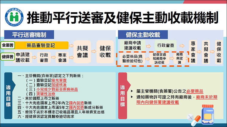 ▸為提升國人用藥可近性,加速新藥納入健保,健保推動平行審查機制、主動收載藥品機制,並鬆綁書面申請文件相關規範。