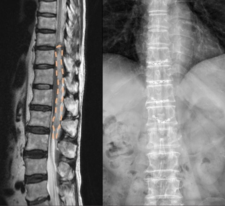 ▲左為術前磁振造影顯示硬脊膜外血腫(橘色)造成脊髓壓迫病變,右為術後脊椎X光檢查顯示手術部位骨頭固定良好。(圖/輔大醫院提供)