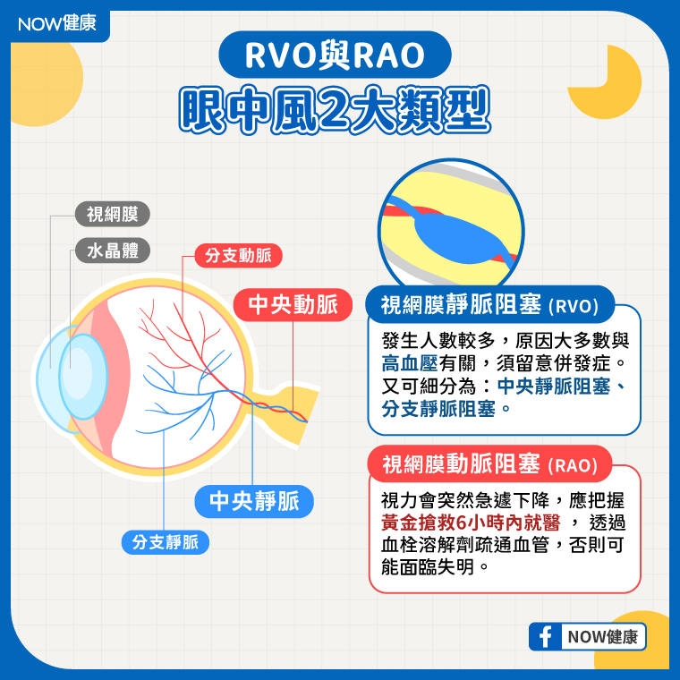 ▲眼中風一般可區分為視網膜靜脈阻塞(RVO)及視網膜動脈阻塞(RAO)這2類型。(圖/NOW健康製作)