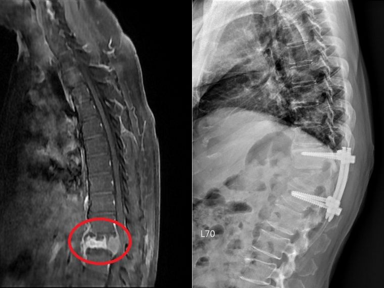 ▲邱先生胸椎第12節有塌陷情形,且已經壓迫神經管,影像懷疑為腫瘤骨轉移導致的非單純骨質疏鬆之壓迫性骨折。(圖/台北慈濟醫院提供)