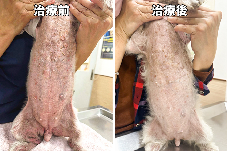 針對貴賓犬的治療方案,獸醫師胡瑋玲建議,先以藥浴控制狗狗的感染情形,爾後再更換合適的沐浴乳,另外口服藥依情形減量,同時衛教飼主使用慕斯或凝膠等保養品,進行日常皮膚護理。此外,個案在進行食物排除測試,確認對特定食物過敏,更換食物後,病情也有所緩解,如今皮膚狀況已明顯比往日穩定許多。