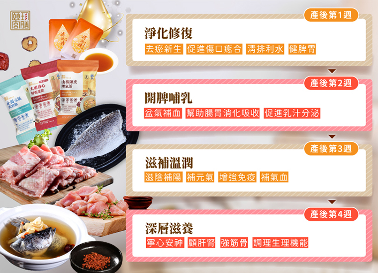 頤珍宮膳從產後修復的4大階段出發,設計出最貼心的食補方案,同時也推出坐月子居家料理食材組:月膳箱共12款。