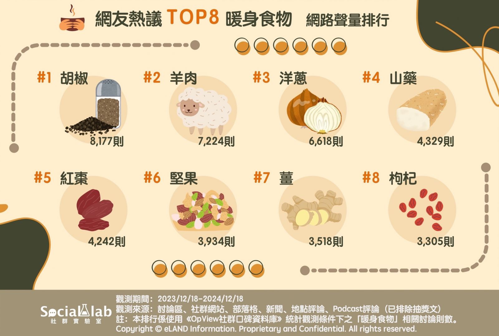 【NOW健康 翁靖祐/台北報導】寒風刺骨的冬季,總讓人渴望來點溫暖身心的食物,無論是滋補的佳餚或簡單的小點,只要選對合適食材,不僅能驅走寒意,還能增強免疫力,為健康加分。接著就一起來看看冬天有哪些必備的暖身聖品吧!《Social Lab社群實驗室》本次透過《OpView社群口碑資料庫》追蹤近1年內「暖身食物」話題的網路聲量表現,帶您了解網友熱議的8大暖身食物。
