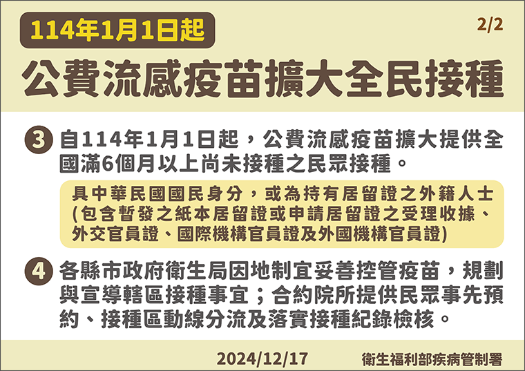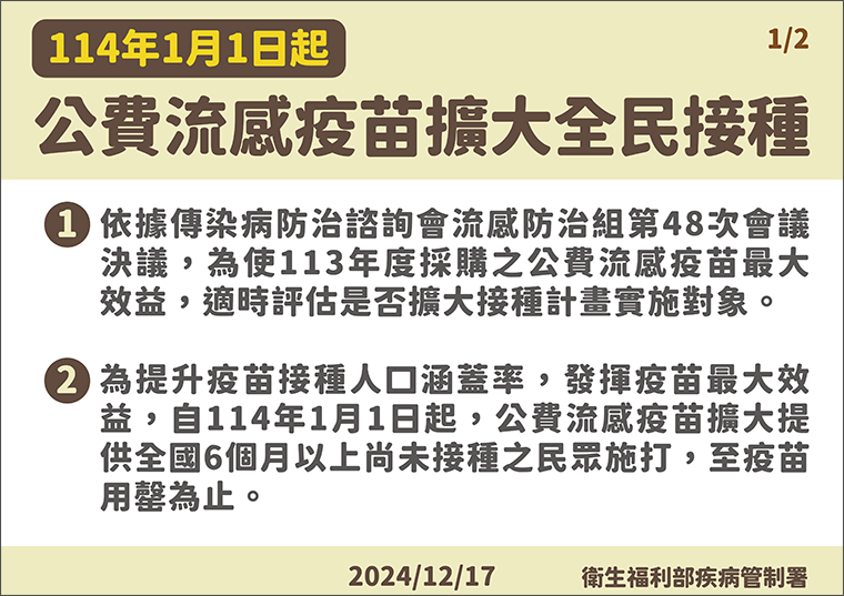 疾管署表示,考量鄰近國家皆有流感活動度上升趨勢,且我國已進入流感流行期,自2025年1月1日起,公費流感疫苗將擴大提供全國滿6個月以上尚未接種之民眾(具中華民國國民身分,或持有居留證之外籍人士)接種直至疫苗用罄止,呼籲符合公費流感疫苗資格民眾儘速前往接種。