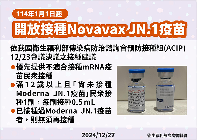 針對國人新冠疫苗接種情形,疾管署公告,截至12月30日止,新冠疫苗接種數仍持續高於去年,已累計接種177.3萬人次,為去年同期(76.4萬)約2.3倍。同時也宣布,自明日起提供民眾接種1劑Novavax JN.1疫苗,優先提供不適合接種mRNA疫苗者接種,以降低重症及死亡風險。此外,提醒如已接種過Moderna JN.1疫苗者,則無須再接種Novavax JN.1疫苗。