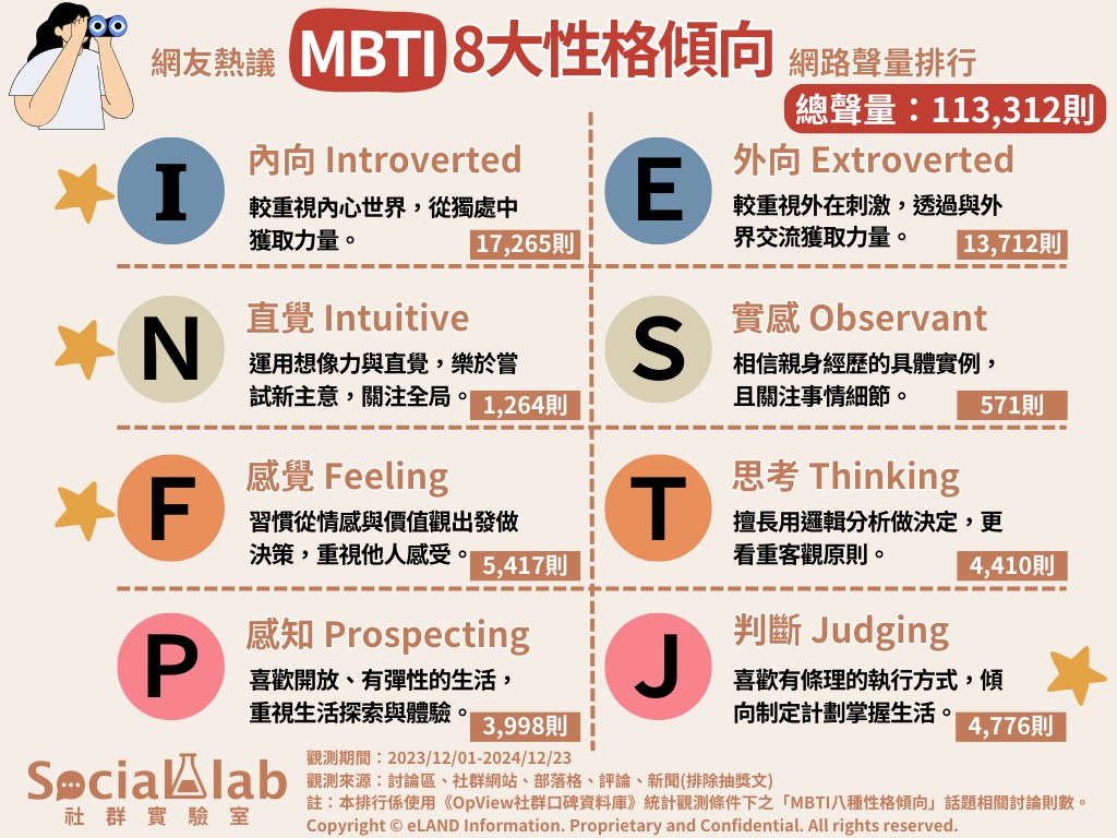 【NOW健康 翁靖祐/台北報導】MBTI可說是近年來最熱門的人格測驗,透過4大維度及每維度的2個字母,組合成共16種人格類型。除了各圈名人紛紛瘋測,MBTI 也成為年輕族群在社群上常用的自我標籤,以不同人格所延伸出的產品、歌曲、生活方式等更是層出不窮,相關話題備受關注,近1年討論聲量突破10萬則。究竟這8個字母代表著什麼樣的人格傾向呢?就讓我們來一探究竟吧!《Social Lab社群實驗室》本次透過《OpView社群口碑資料庫》追蹤近1年「MBTI的8種性格傾向」話題的網路聲量表現,帶您了解網友熱議的8大MBTI性格傾向。