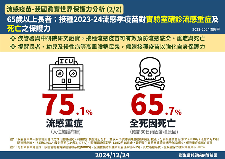 ▲本土研究證實,長者接種流感疫苗可預防感染、重症、死亡風險。(圖/疾管署提供)