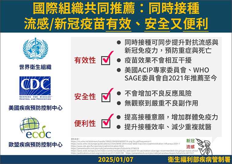 疾管署強調,因農曆春節將至,民眾出國旅遊及往來頻繁,更增加疫情傳播風險,呼籲65歲以上長者、幼兒及慢性病患等高風險族群,應儘速完成流感及新冠疫苗接種,以獲及早獲得保護力,降低感染後發生重症和死亡風險,保障自身與家人健康,平安過好年。