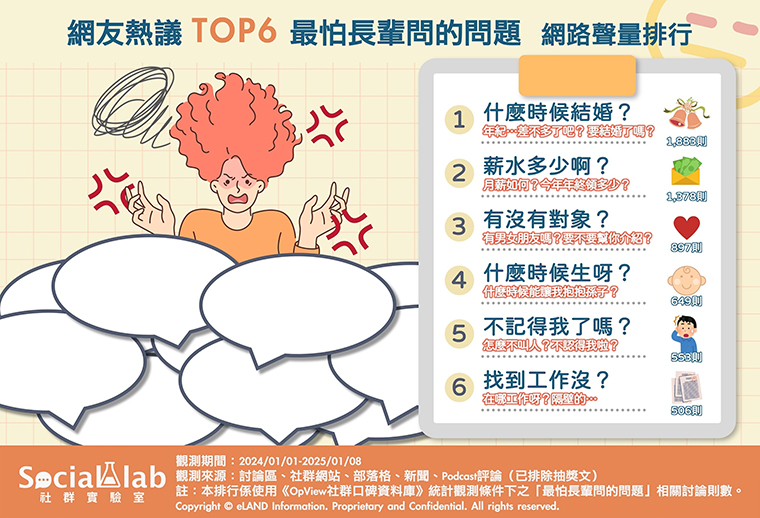 【NOW健康 陳郁茹/台北報導】在過年團聚的歡樂氣氛中,許久不見的長輩們總免不了關心晚輩的近況。然而,這份關心有時會化為令人尷尬的提問,甚至涉及個人隱私,讓人難以招架。這些流傳於親戚長輩間的「必問題」往往成為不少人心中的壓力來源,既頭痛又無奈。那麼,在眾多「靈魂拷問」中,又以哪些問題最讓人不知所措呢?《Social Lab社群實驗室》本次透過《OpView社群口碑資料庫》追蹤近1年「最怕長輩問的問題」話題的網路聲量表現,帶您了解網友熱議的最怕長輩問的問題排行。