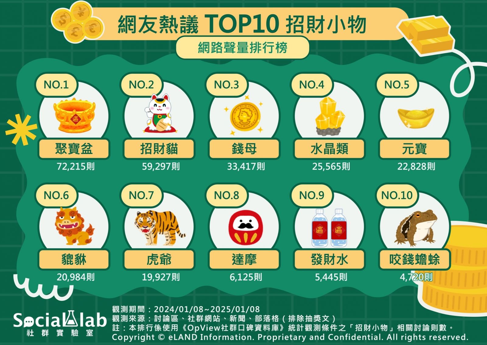 【NOW健康 翁靖祐/台北報導】新的一年來臨,想讓財運亨通、生活富足的人想必不在少數!無論是傳統文化中的吉祥物,還是充滿設計感的創意招財小物,不僅能為居家或辦公空間增添特色,更承載了對事業成功、財運滾滾的美好期盼。不過,市面上招財小物令人眼花撩亂,究竟哪些才是網友心目中帶來好運的最佳選擇呢?《Social Lab社群實驗室》本次透過《OpView社群口碑資料庫》追蹤近1年「招財小物」話題的網路聲量表現,帶您了解網友熱議的10大招財小物。