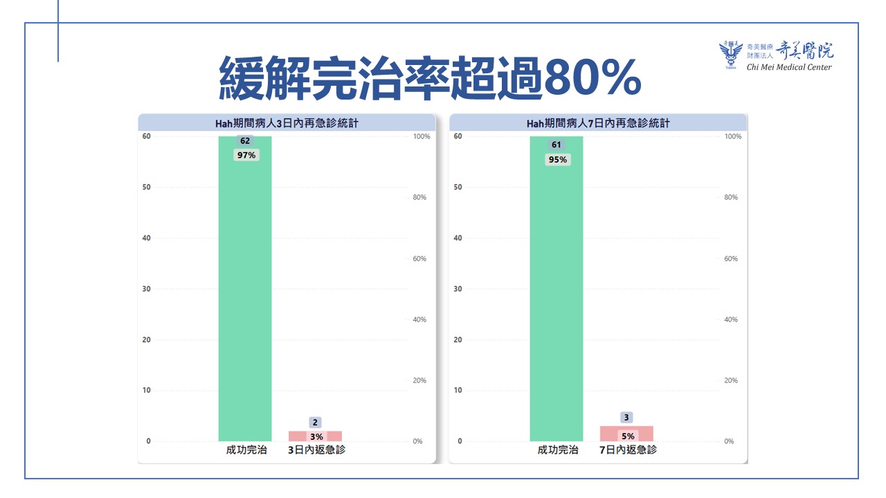 截至2025年1月底,奇美醫院HAH團隊於短短6個月內,急診高齡病人相較於在宅急症照護的病人之3日內再返急診率於10.4%降低至6.7%、14日內再返急診率從18.2%降低至13.3%、3日內再住院率從9%降低智6.7%、14日內再住院率於17.9%降低至13.3%、1個月內死亡率從16.4%降低至10%,並且疾病緩解完治率高達80%以上。病人與家屬普遍認為,在熟悉的居家環境中接受治療不僅更舒適,還有助於康復,滿意度高達98%。