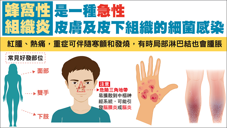 【NOW健康 林郁敏/台北報導】蜂窩性組織炎是一種急性皮膚及皮下組織的細菌感染,通常由細菌引起,造成紅腫、熱痛,重症可伴隨寒顫和發燒,有時局部淋巴結也會腫脹。此病最常見於下肢、面部和雙手,而軀幹較少受影響。特別需注意的是所謂的「危險三角地帶」,即從鼻根延伸到兩側鼻翼的區域,此區域若感染,細菌更容易擴散到中樞神經系統,可能引發腦膜炎或腦炎。