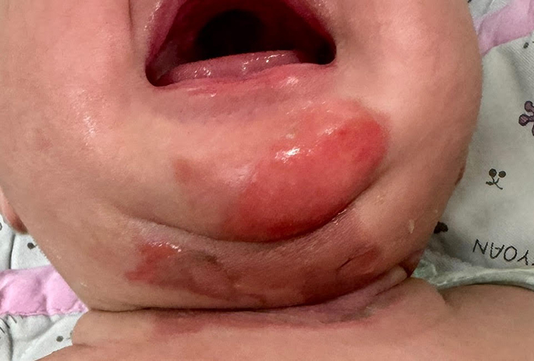 ▲個案中的寶寶因父母使用熱水蒸氣試圖舒緩其鼻塞症狀,過程中熱水不慎潑灑,導致下巴、脖子及肩膀等多處燙傷。(圖/新竹臺大分院提供)
