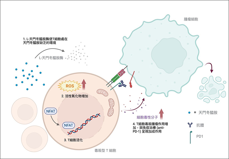 ▲天門冬醯胺缺乏促進毒殺型T細胞活化示意圖。(圖/長庚醫院提供)