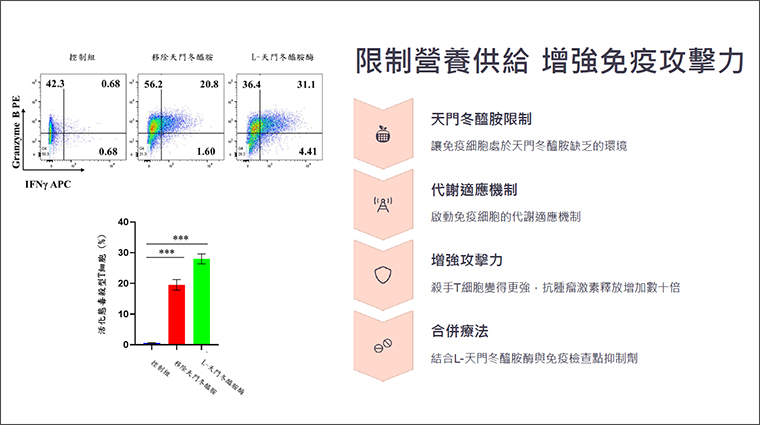楊皇煜說明,免疫細胞具備代謝適應能力,研究團隊找到特定養分「天門冬醯胺」(Asparagine),該成分可以激化免疫細胞活性。「天門冬醯胺」對癌細胞和免疫細胞來說,均是重要養分,研究發現,如果限制天門冬醯胺供應,讓免疫細胞處於天門冬醯胺缺乏的環境時,將啟動免疫細胞的代謝適應機制,讓CD8+ T細胞(殺手T細胞)變得更強,更具攻擊力,在體外培養實驗中發現,此時抗腫瘤激素釋放增加10倍,大幅提高抗癌能力。