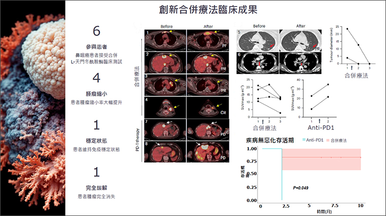 研究團隊針對6名40至60歲鼻咽癌患者,進行L-天門冬酰胺酶臨床測試,在10個月內追蹤腫瘤大小變化。結果顯示,4名鼻咽癌患者腫瘤明顯縮小,1名患者維持免疫穩定狀態,另1名患者達到完全緩解,腫瘤消失不見,相當神奇。