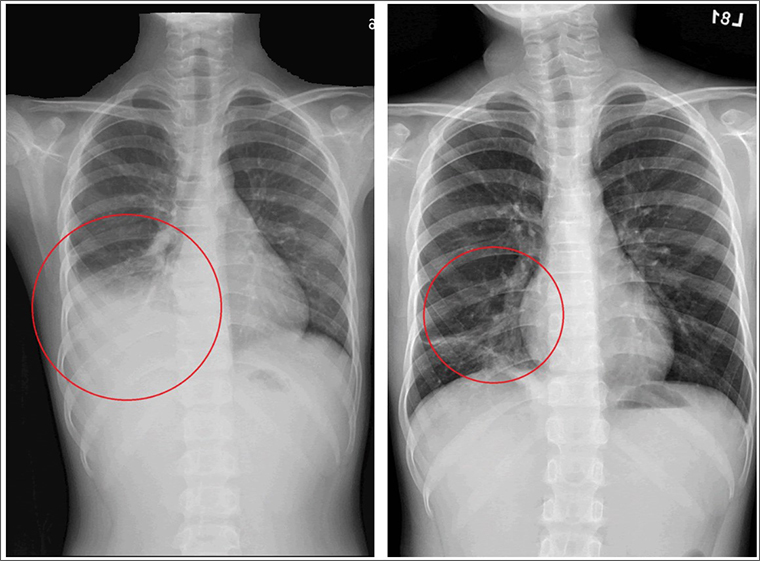 ▲許小弟在一開始接受抗生素治療後仍然高燒未退,甚至出現肺炎擴散及肋膜積水的情形(左);先後使用口服四環黴素及喹諾酮類藥物進行治療後,肺部積水才明顯減少(右)。(圖/台北慈濟醫院提供)