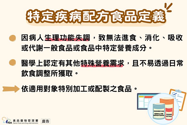 食藥署食品組副組長蕭惠文表示,「特定疾病配方食品」是指當病人因生理功能失調,導致無法進食、消化、吸收或代謝一般食品或食品中特定營養成分,或醫學上認定有其他特殊營養需求,且不易透過日常飲食調整所獲取時,可作為病人單一營養來源或部分營養補充的配方食品。