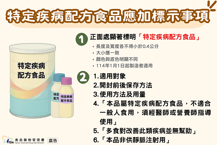蕭惠文表示,自114年1月1日起,特定疾病配方食品必須在外包裝正面處,顯著標明「特定疾病配方食品」等字樣。