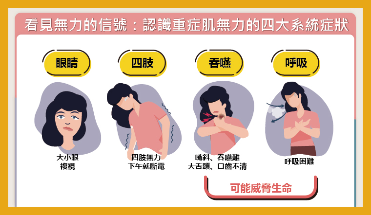 ▲認識重症肌無力的四大系統症狀,重症肌無力影響「眼睛、四肢、吞嚥、呼吸」等系統。(圖/台灣神經免疫醫學會提供)