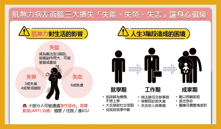 ▲肌無力病友面臨三大損失「失能、失勞、失志」讓身心俱疲。(圖/台灣神經免疫醫學會提供)