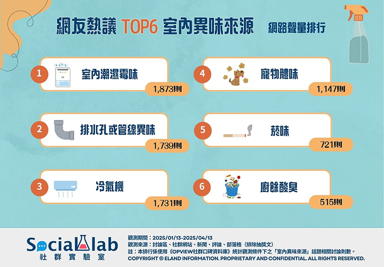 【NOW健康 陳如頤/台北報導】你是否覺得家裡明明打掃過,卻總有異味散不去?許多室內空氣中的臭味往往隱藏在我們忽略的細節中。長期處於異味環境不僅降低生活品質,更可能危害健康。想找出異味來源、改善居家空氣,不妨從以下常見的臭味藏身處開始檢查!《Social Lab社群實驗室》本次透過《OpView社群口碑資料庫》追蹤3個月內「室內異味來源」相關話題的網路聲量,帶您了解網友熱議的居家臭味元凶。