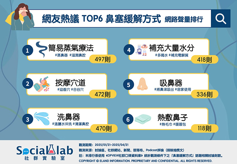 【NOW健康 陳如頤/台北報導】氣溫變化、空汙或季節性過敏常引發鼻塞,影響精神與生活品質,過敏兒或幼童尤其難受。如何有效緩解鼻塞成為網路熱議焦點,讓我們一同探索網友們的應對妙招!《Social Lab社群實驗室》本次透過《OpView社群口碑資料庫》追蹤近3個月內「鼻塞緩解方式」相關話題的網路聲量,帶您了解網友熱議的六大鼻塞緩解方式。