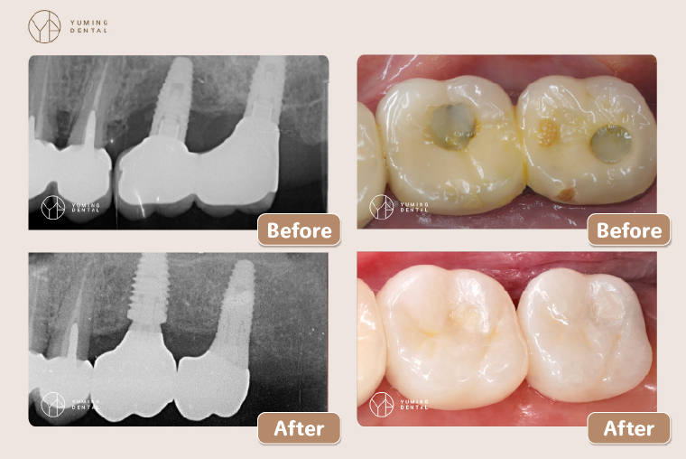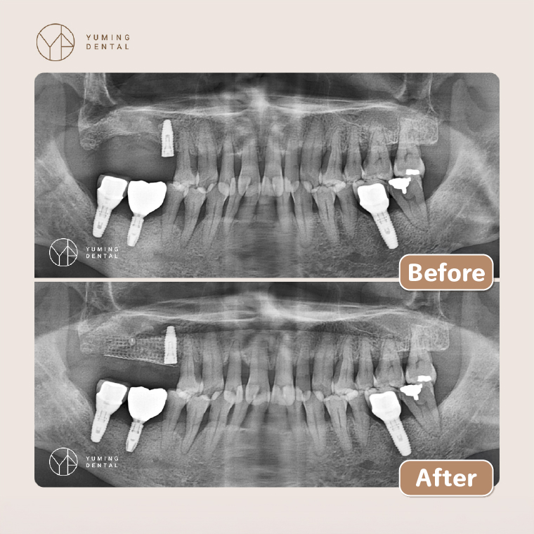 另1名60多歲的婆婆,約10年前也植了10顆牙,如今壞了1顆需拔除重植。這次透過補骨手術,植牙過程加上手術導板輔助,讓手術時間縮短、患者體感也舒適不少,最終完成的假牙也更自然美觀。
