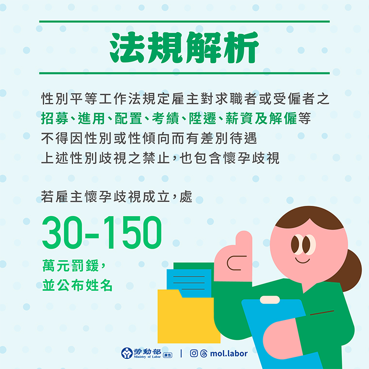 ▲若雇主懷孕歧視成立,處30至150萬元罰鍰,並公布姓名。(圖/勞動部提供)