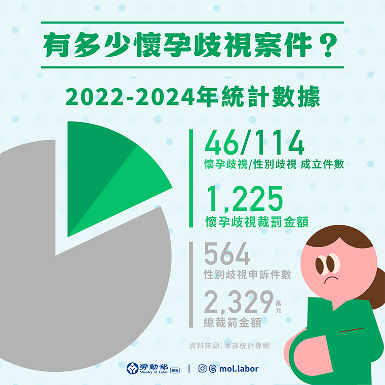 懷孕就業歧視亦為性別歧視的一種,根據本部近3年(111年至113年)統計調查,各地方勞工行政主管機關受理「性別歧視」申訴案件共計564件,成立共計114件(占20%),裁罰金額共計2,329萬元;其中,因懷孕歧視成立之件數共46件,裁罰金額共計1,225萬元。違法資訊可至違反勞動法令事業單位(雇主)查詢系統瀏覽查詢。