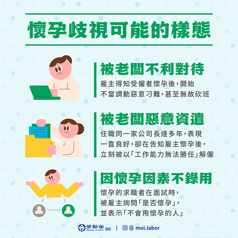 ▲常見懷孕歧視樣態有3種。(圖/勞動部提供)