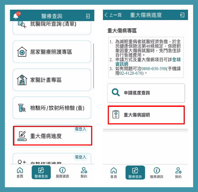 2.進入醫療查詢/重大傷病專區。
