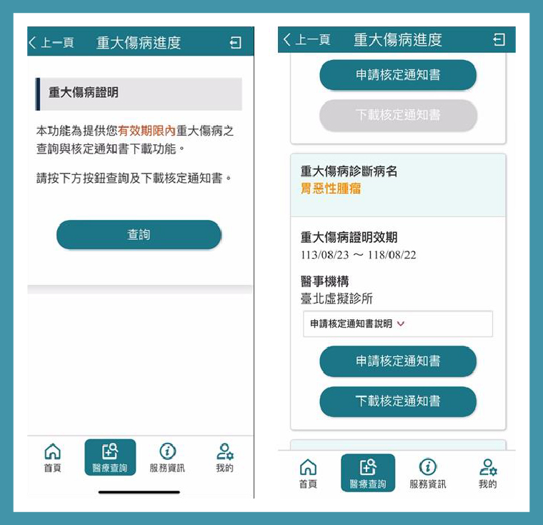 3.登入後可查詢重大傷病申請進度、查詢重大傷病效期,下載本人已核定之重大傷病核定通知書功能。