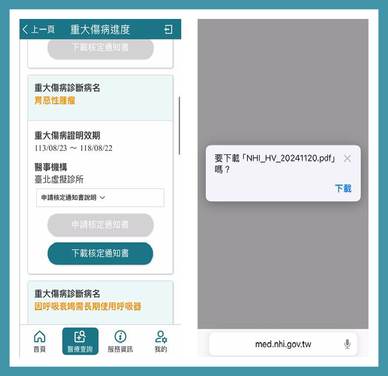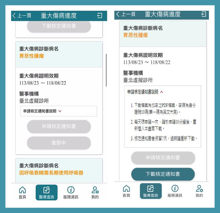 ▲健保快易通APP可申請及下載重大傷病核定通知書。(圖/健保署提供)
