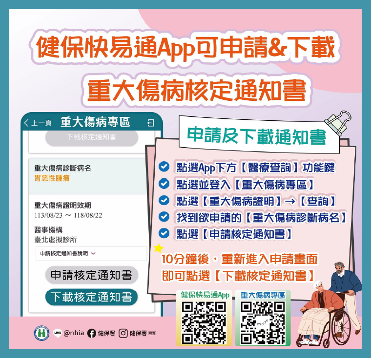 ▲符合資格者申請重大傷病卡,核定通過後,需臨櫃排隊申請重大傷病的紙本核定通知書,可透過健保快易通APP下載。(圖/健保署提供)