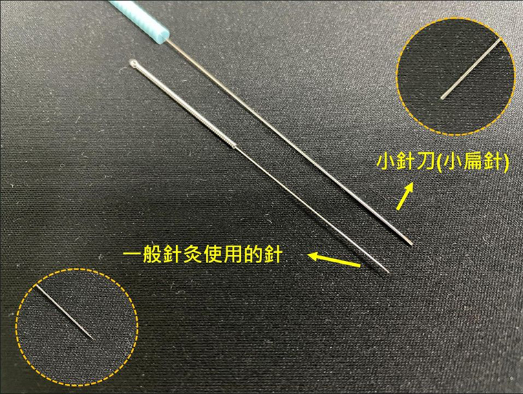 ▲一般針灸使用的針(左)與小扁針(小針刀)(右)兩者不同處。(圖/奇美醫療財團法人奇美醫院提供)