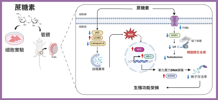 ▲北醫大夏詩閔教授研究團隊發現,蔗糖素抑制睪丸中的甜味受體T1R3表現,進而影響性荷爾蒙的分泌,同時加上氧化壓力升高及自噬能力異常,最終導致精子活力下降與形態異常。(圖/台北醫學大學提供)