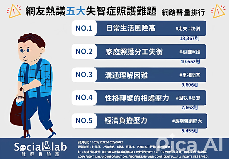 【NOW健康 陳如頤/台北報導】由秦漢、謝盈萱主演的Netflix台劇《忘了我記得》播出後迴響熱烈。劇中細膩描繪女兒照護失智症父親的歷程,情節觸動人心,更映照出失智照護的現實處境,讓廣大觀眾得以理解失智症照顧者面對的心酸與掙扎。《Social Lab社群實驗室》本次透過《OpView社群口碑資料庫》追蹤近半年內「失智症照護難題」相關話題的網路聲量,帶您了解網友熱議的5大失智症照護難題有哪些。