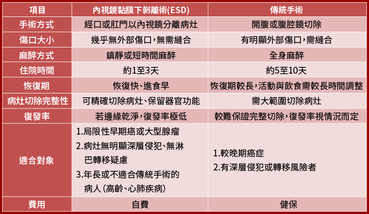 在過去,診斷出早期消化道癌症後,病人往往需接受腹部開刀、胃或腸部分切除等手術,不僅恢復期長、風險高,還可能影響日後的生活品質。但隨著醫療技術進步,內視鏡黏膜下剝離術(ESD)已被國際胃腸癌症治療指南列為早期癌的第一線治療選擇之一,尤其對於希望保留器官完整性、提升術後生活品質的病人來說,可大幅降低手術傷害與併發症風險。